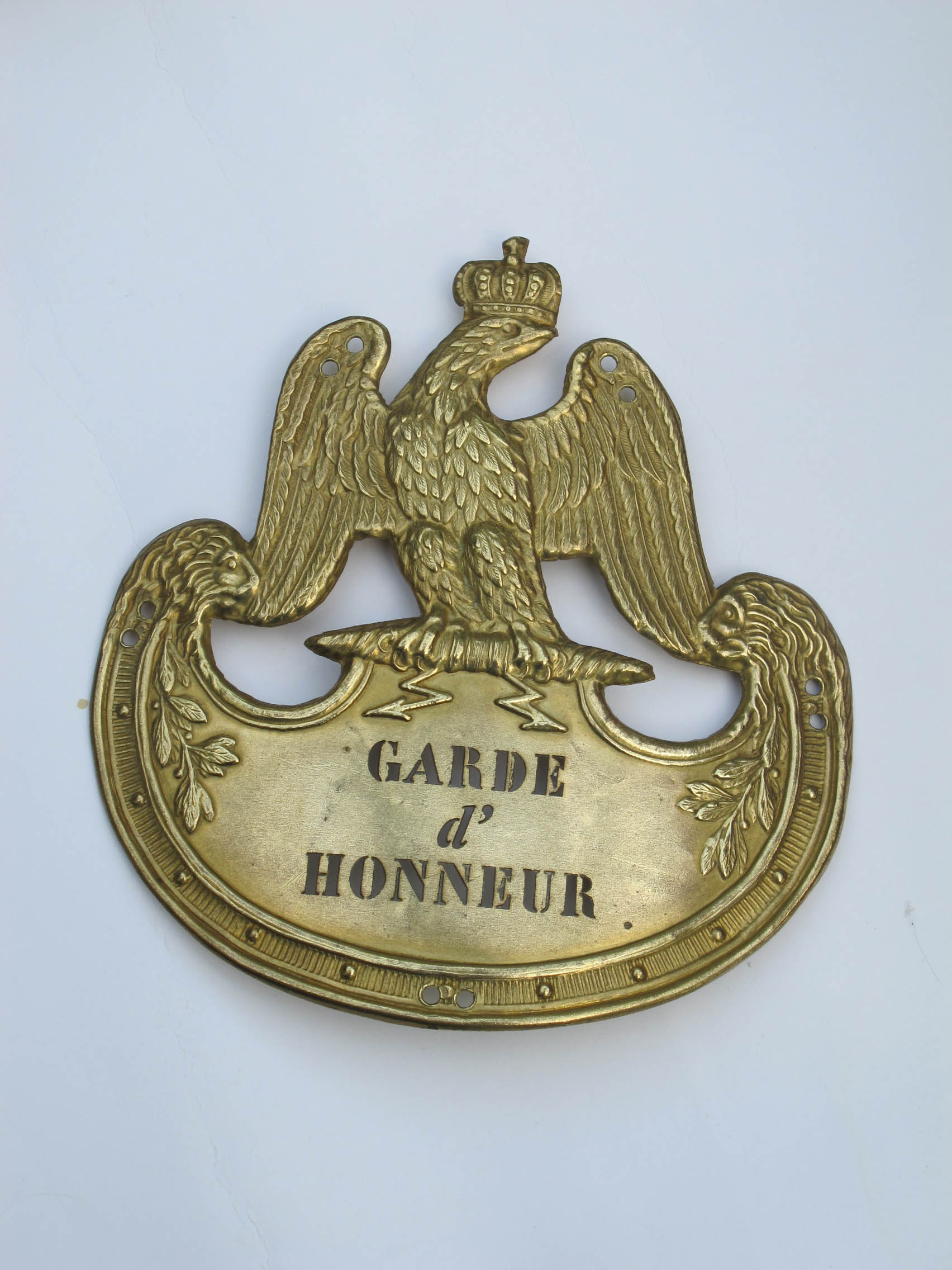 Plaque de Shako de Voltigeur cor de chasse Du règlement 1812 laiton estampé. 115 mm x 135 mm Prix : 110 €